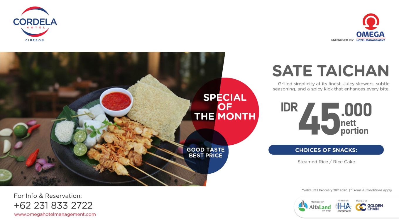 The Sate Taichan Special of The Month at Cordela Hotel Cirebon is available for a limited time and valid until the end of the promotional period. Early visits are recommended so you don't miss out on this flavorful offer.