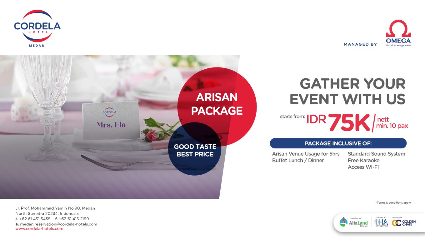 Cordela Hotel Medan proudly presents its exclusive Arisan Package starting from only IDR 75,000 nett per person, with a minimum booking of 10 pax. This value-packed deal is perfect for guests who want to enjoy quality food, a cozy venue, and excellent service all in one place.