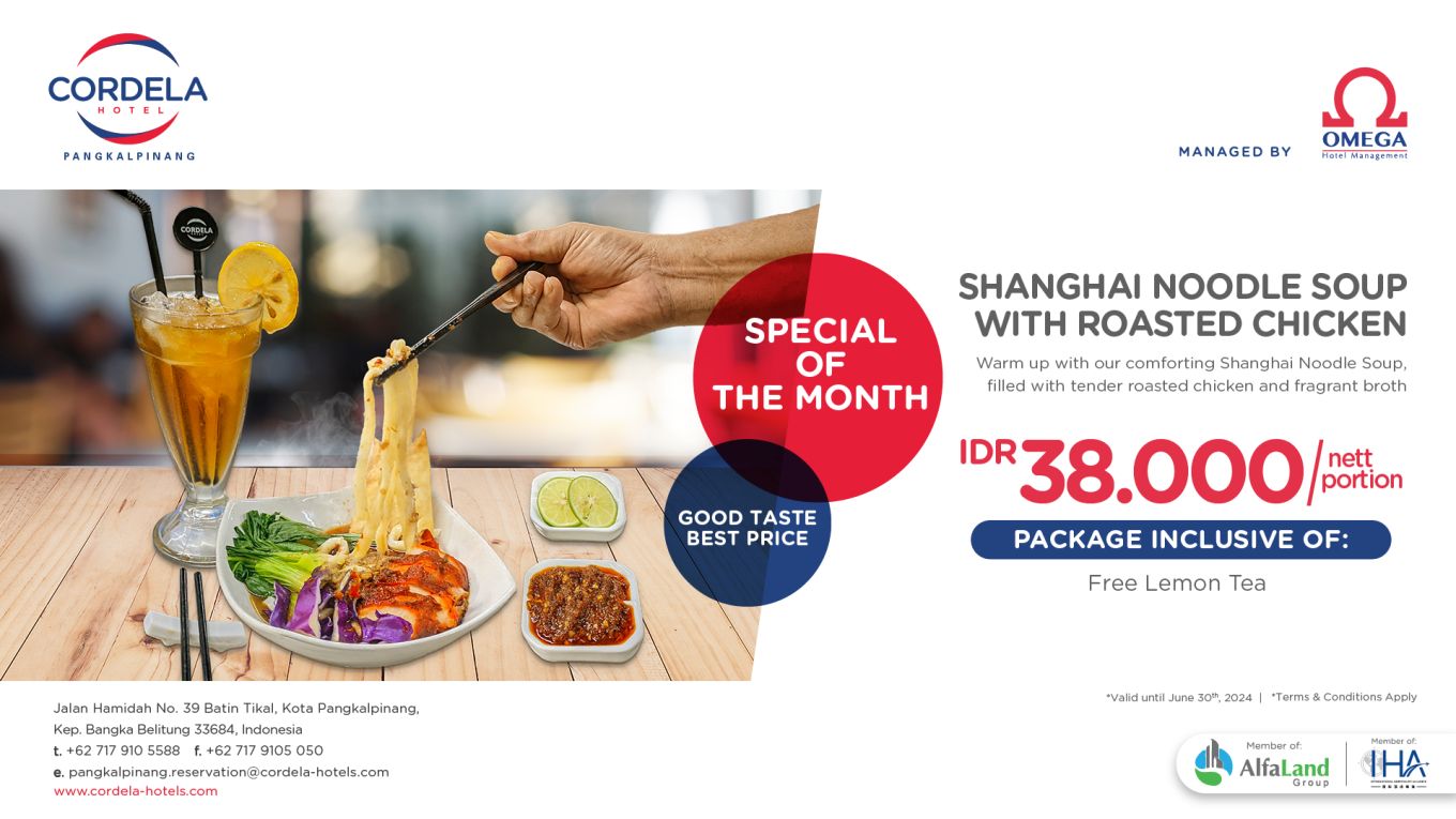 Cordela Hotel. Reserve your table now and indulge in our delicious Shanghai Noodle Soup with Roasted Chicken. Trust us, each bite will take you on an amazing flavor adventure. Below are the prices and packages we have prepared.