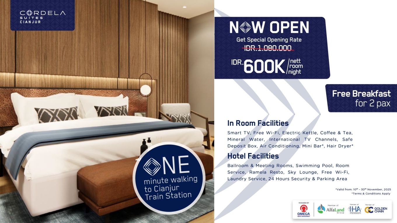 There's no better time to plan your stay than now. With the special opening rate of IDR 600K nett per room per night and free breakfast for two, guests can experience the luxury and warmth of Cordela Suites Cianjur at an incredible value. The offer is available for a limited time, from 10th to 30th November 2025, so make your reservation today before rooms run out.